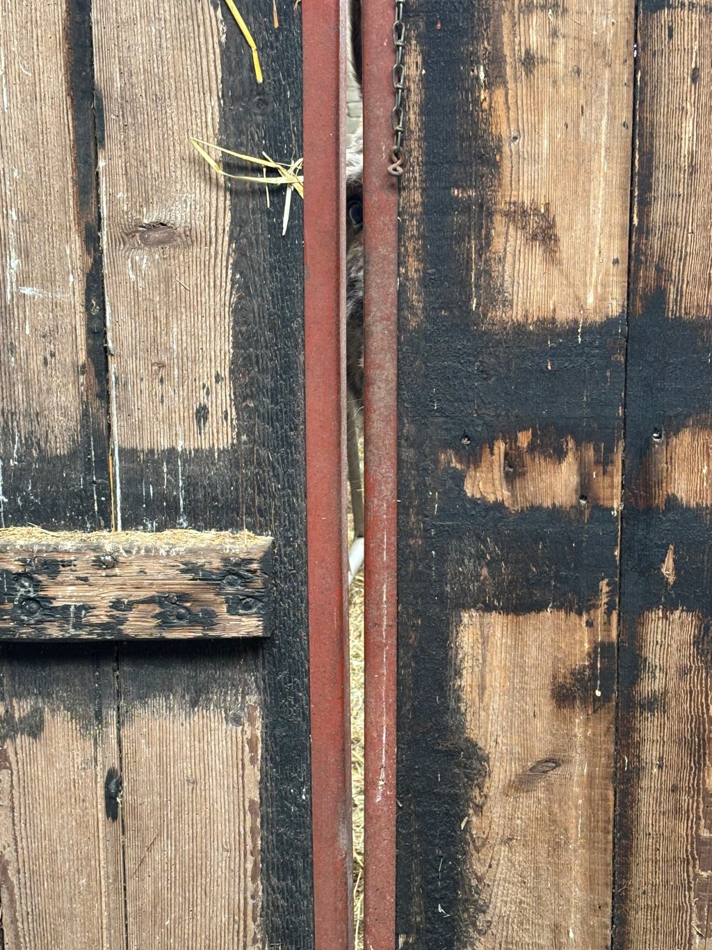 Ik ging verder met mijn ochtendritueel. Deed de buitenstaldeur open, legde hooi en stro voor hen klaar, vulde de waterbak bij, liep naar de ruimte voor de stal, zette daar het voer voor de avond klaar … en ineens had ik het gevoel dat er naar mij werd gekeken. Sjaak hield mij aan mijn belofte en gluurde via de kier van de staldeur naar mij. ‘Ach schat, was ik je vergeten?’